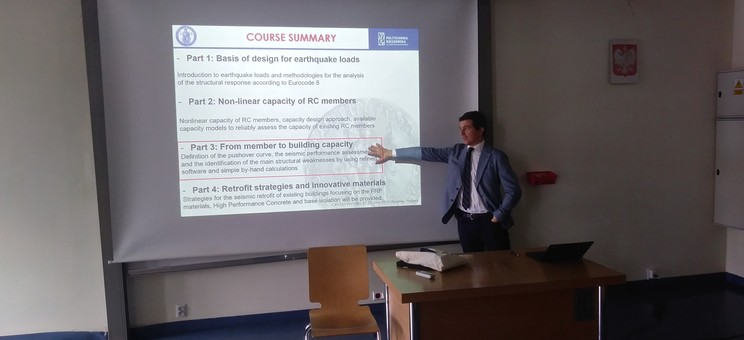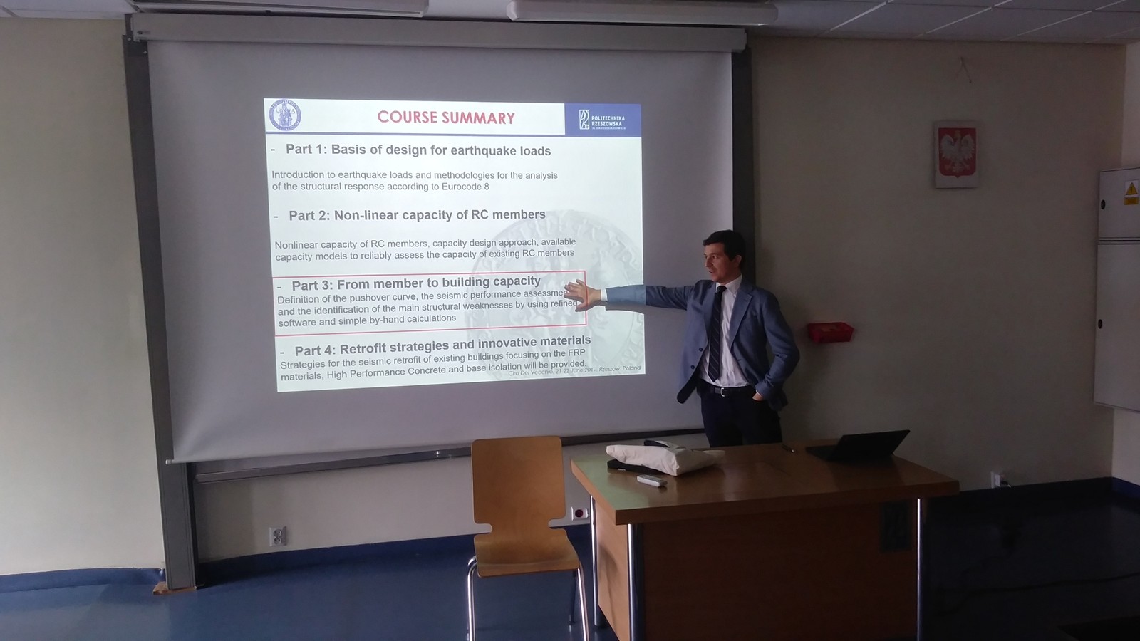 Głównym celem wizyty na Wydziale Budownictwa i Inżynierii Środowiska PRz w ramach programu ERASMUS+ było wygłoszenie serii wykładów dotyczących projektowania i wzmacniania konstrukcji poddanych wpływom sejsmicznym. Nasi studenci mieli okazję poznać specyfikę obciążeń symulujących efekty trzęsień ziemi oraz zasady uwzględniania ich w liniowej i nieliniowej analizie konstrukcji żelbetowych, a także dowiedzieć się o innowacyjnych metodach ograniczania wpływów drgań sejsmicznych na budynki oraz wzmacniania konstrukcji narażonych na działanie trzęsień ziemi.